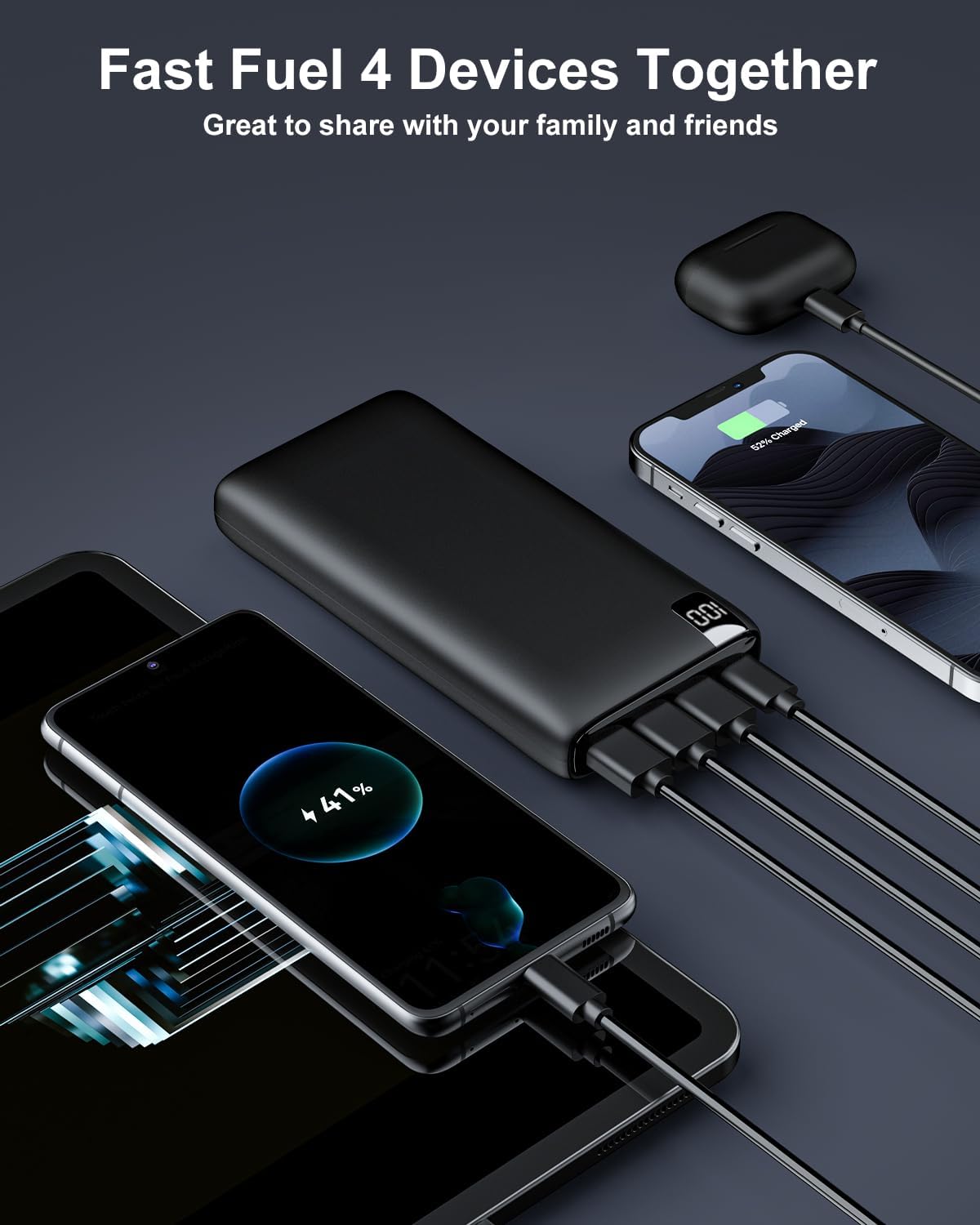 The built-in LED display allows you to easily monitor the remaining battery level, so you’ll always know when it’s time to recharge the power bank. With four USB outputs, you can charge multiple devices simultaneously, making it perfect for sharing with friends or family during travel or outdoor activities.
